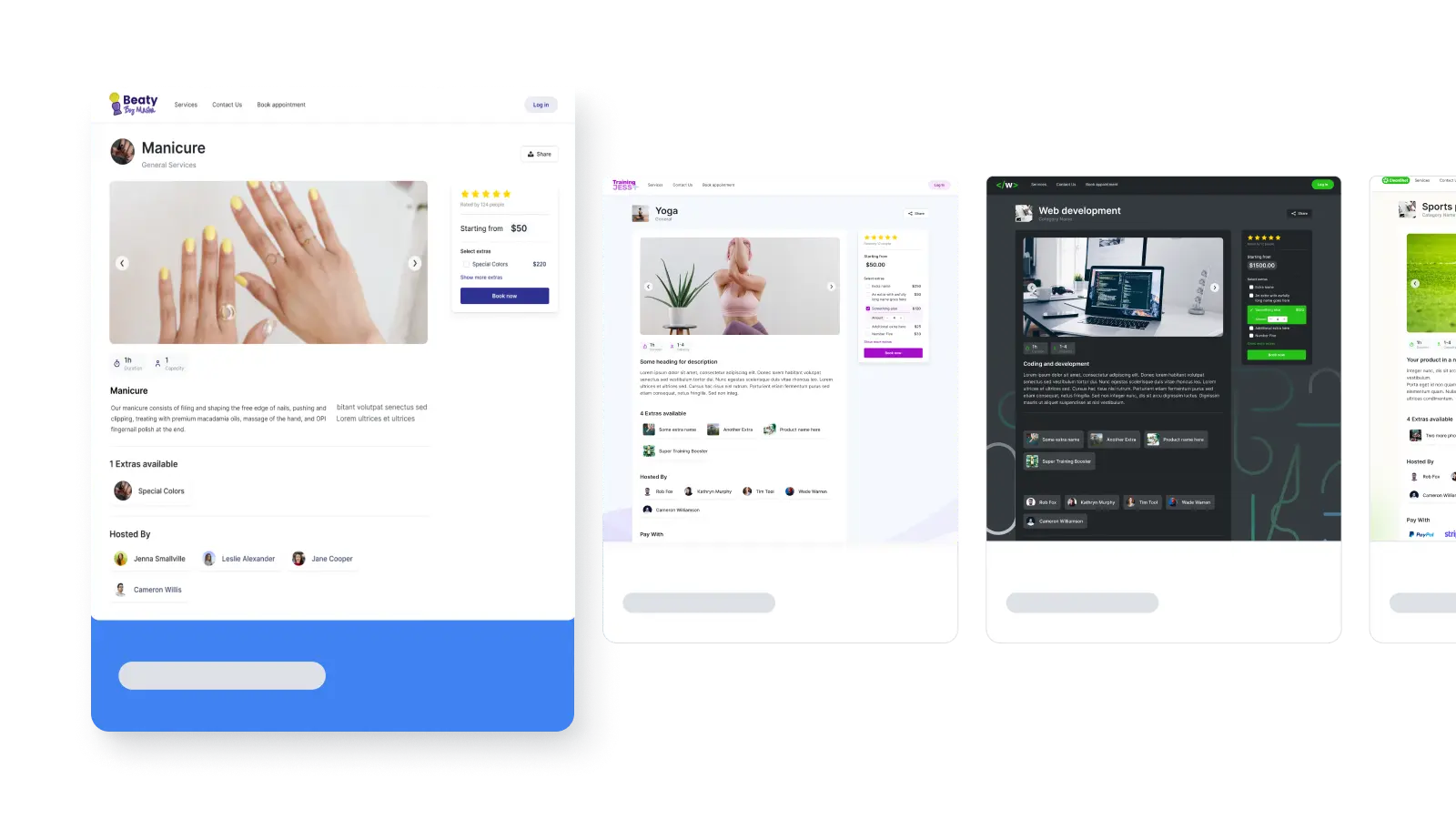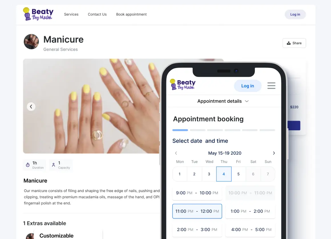O software de agendamento Glamio funciona como um construtor de páginas sem necessidade de programação e cria automaticamente uma página de marcações dedicada. Esta página permite apresentar os seus serviços e o seu calendário, possibilitando que os seus clientes façam marcações de forma prática, 24/7.
